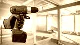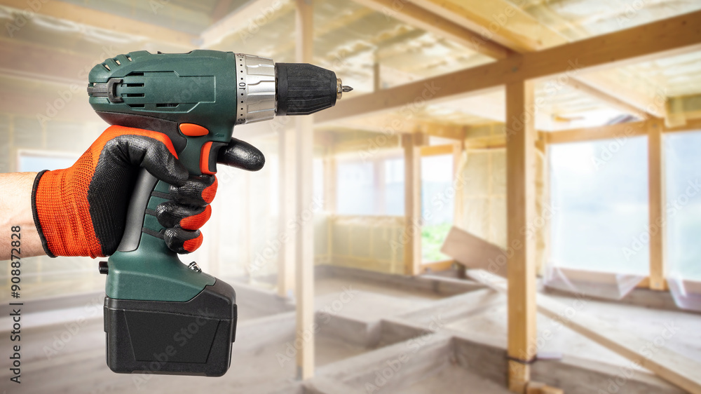 Electric screwdriver in hand. Equipment for construction. Hand master near house under construction. Electrical tool for repair. Screwdriver for mounting fasteners. Electric screwdriver for builder