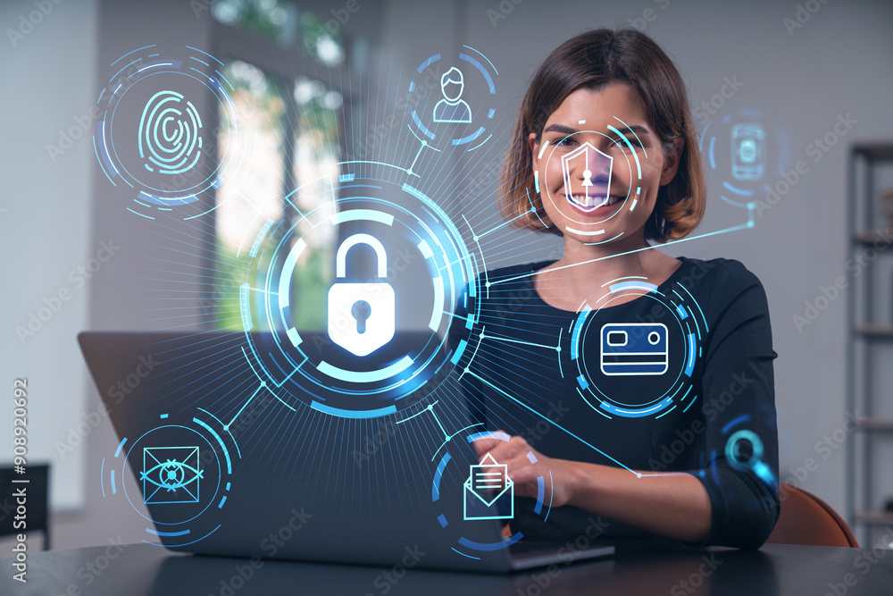 Woman using laptop with cybersecurity icons overlay, representing data protection.