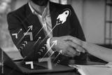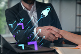 Business handshake with growth symbols and rocket graphic overlay.