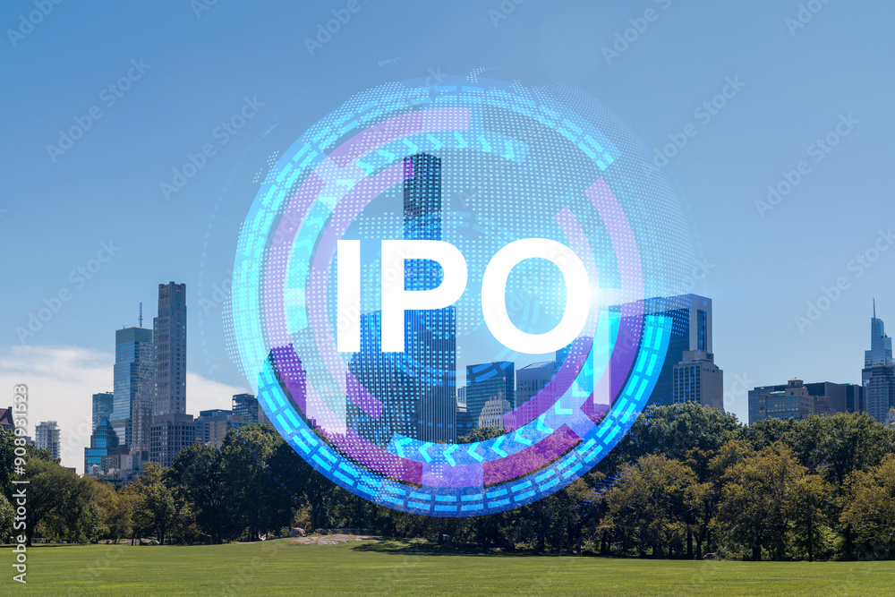 Digital IPO symbol overlaying city skyline with lush park foreground.