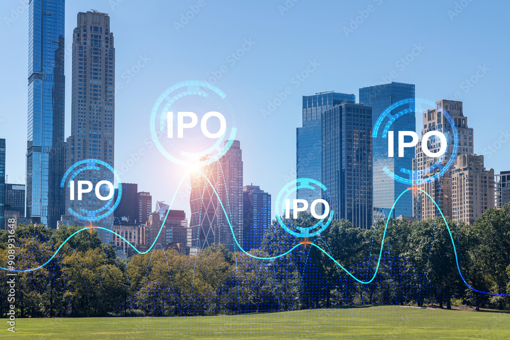 IPO Concept with Digital Graph Overlay on City Skyline Background.