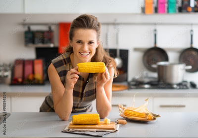 Smiling woman leaning on kitchen counter holding corncob