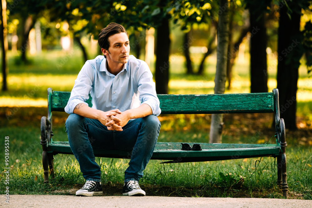 handsome adult man sitting on bench