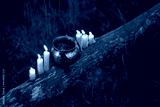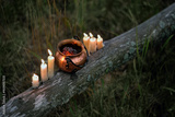 witch cauldron with burning candles outdoor, abstract natural evening background. magic ritual, witchcraft. esoteric spiritual practice. fairytale, mystery atmosphere