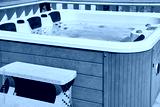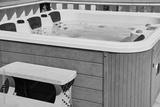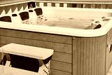 Outdoor hot tub on sunny rooftop deck with bubbling water and comfortable seating. Place for relaxation and leisure during summer vacations