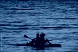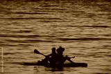 Two people floating on a paddle board at sunset