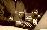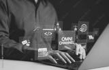 Omni Channel Marketing Concept. Businessman using laptop with digital icons representing omnichannel marketing concepts. include email, e-commerce, social media, analytics, and customer engagement.