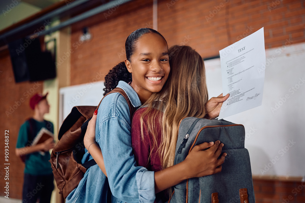 Happy black student and her friend embracing after receiving test results at high school.