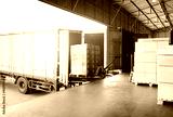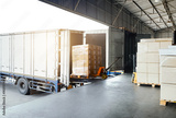 Bulk pallets of packaging boxes being loaded onto a container truck. distribution warehouse Container transport, supply chain, parcel delivery. Freight truck, logistics, transportation.