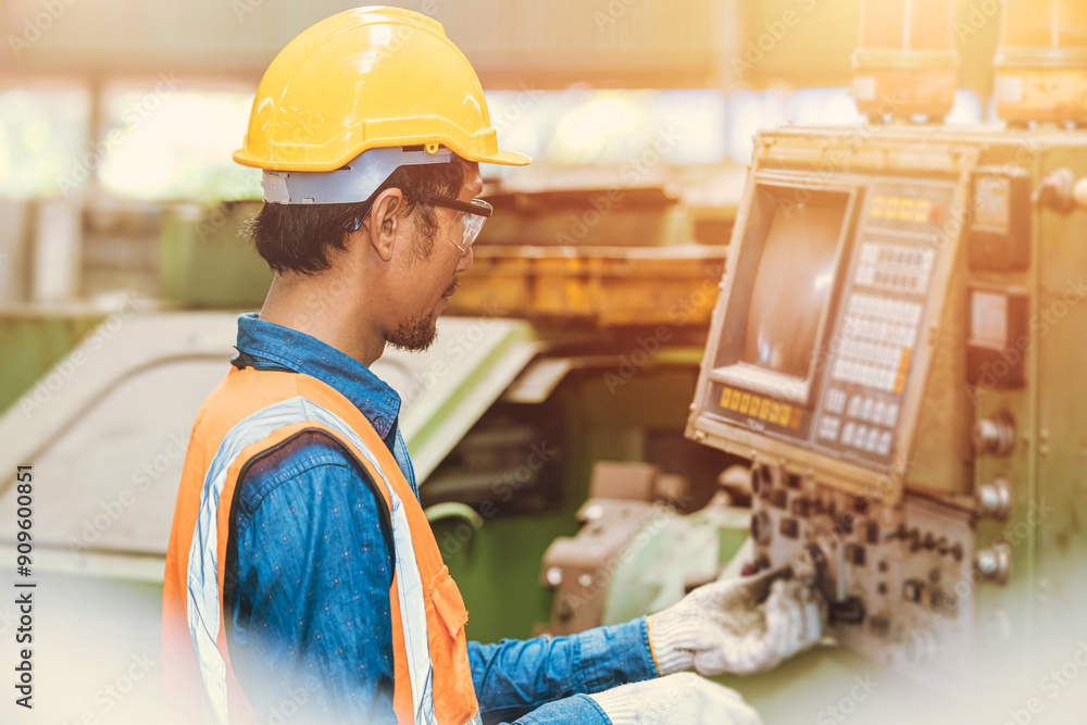 Engineer worker program setup CNC machine in metal industry factory with tablet technology.