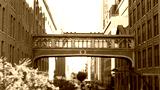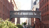 New York City street, Chelsea Market skybridge. Retro industrial architecture, red brick building. American old historic elevated sky bridge Manhattan landmark, USA. Meatpacking district, High Line.