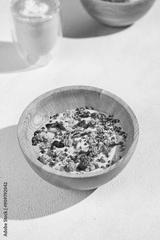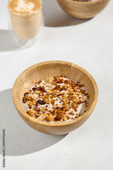Healthy Smoothie Bowl with Dates and Granola in Wooden Bowl on Light Background