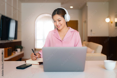 Businesswoman in headphone meeting on video conference and taking note while remote working at home