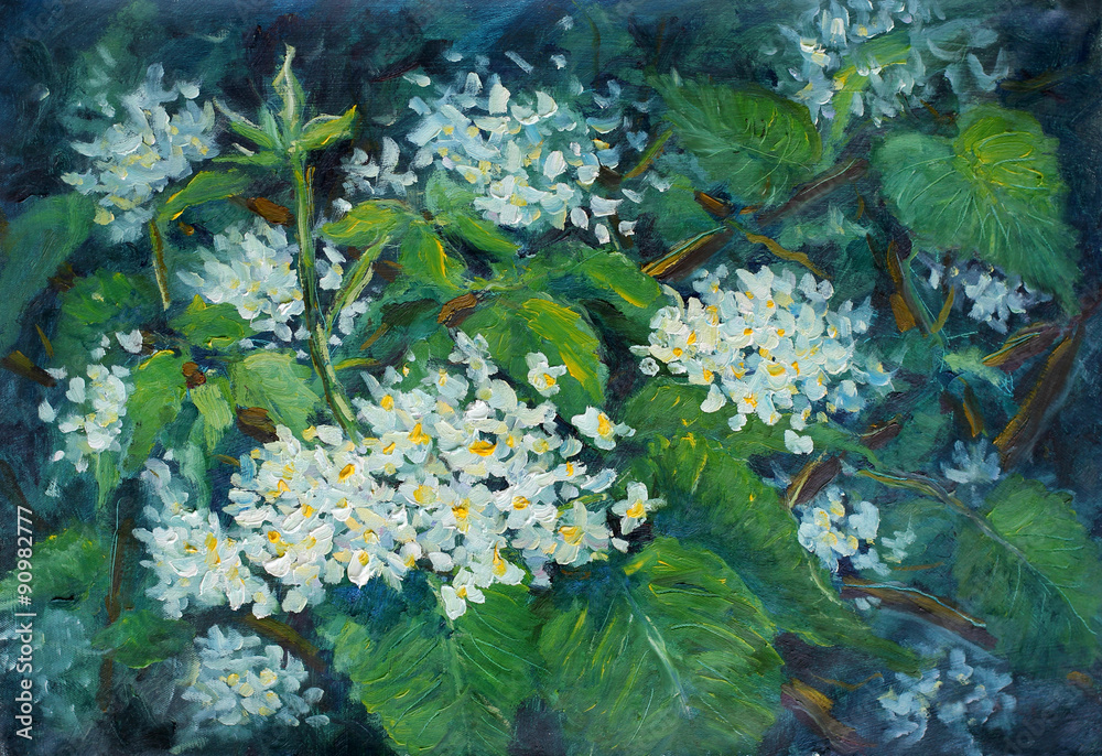 Small pretty white flowers in large green leaves. Floral summer landscape