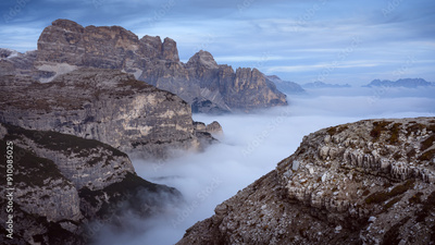 Foggy sunrise mountains in Dolomite Alps. Location Auronzo rifugio in Tre Cime di Lavaredo National Park, Dolomites, Trentino Alto Adige, Italy