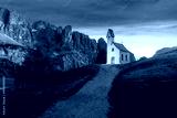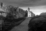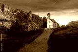 Cozy iIluminated chapel - Kapelle Ciapela on Gardena Pass, Italian Dolomites mountains. Purple sunset light on background. Dolomite Alps, Italy. Landscape photography