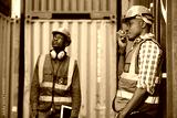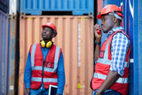 African factory worker or engineer using walkie talkie and talking about work in containers warehouse storage