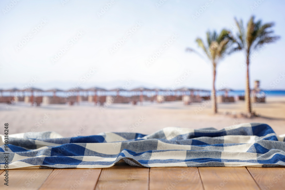 Empty wooden table with checkered tablecloth and copy space for products. Blurred tropical beach background.