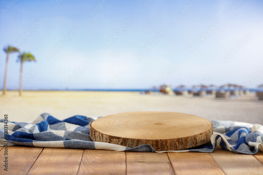 Empty wooden table with checkered tablecloth and copy space for products. Blurred tropical beach background.