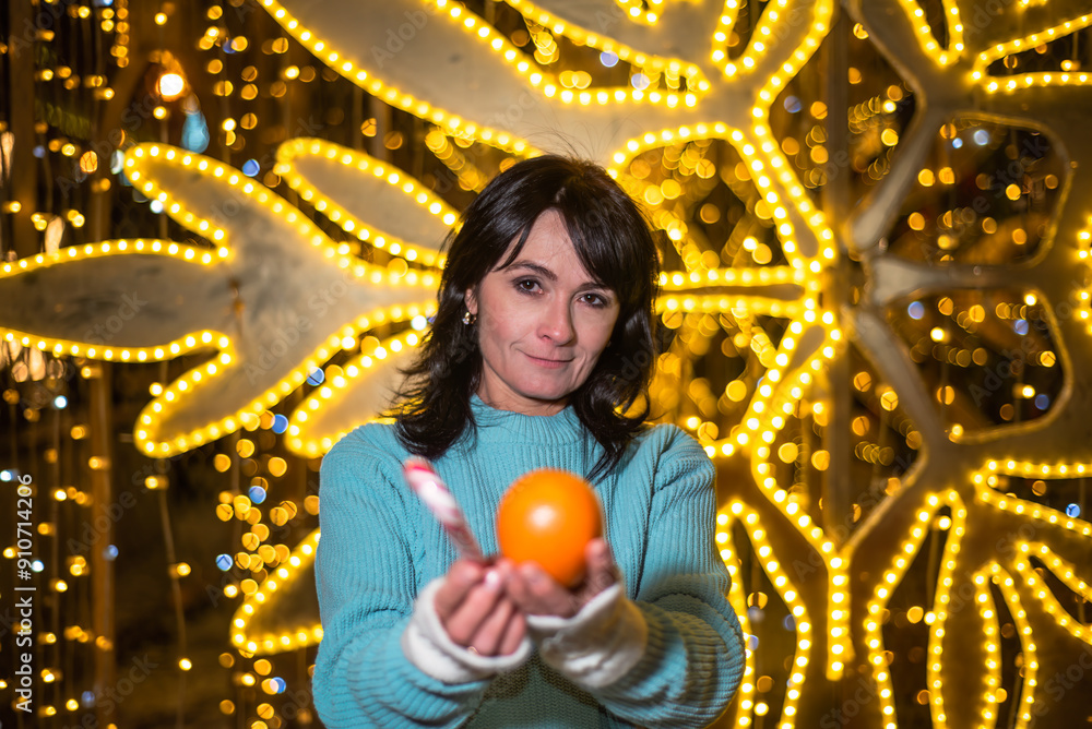 Russian 48 years old woman in blue sweater holding tangerines against yellow christmas lights before Christmas