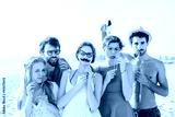 Summer, sandy beach at sunset. A group of friends at a party on the beach, having fun with mustaches, hearts, fake glasses and objects to joke