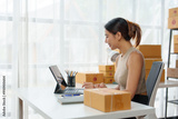 .Asian Small business entrepreneur SME working with box and Calculating product prices for customersat home, SME e-commerce digital technology concept.
