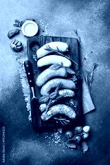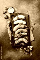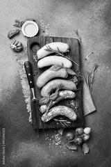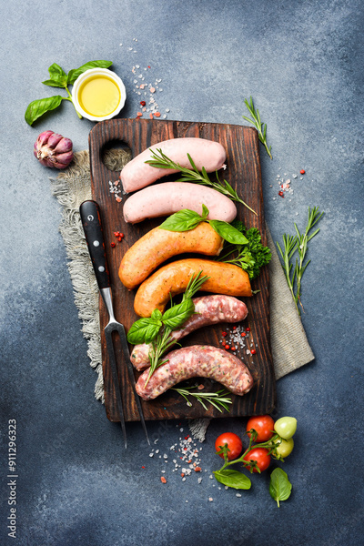 Large Set Uncooked barbecue sausages: beef, pork and chicken sausages. On a wooden cutting board. Top view.