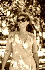Portrait of young beautiful smiling woman wearing pale pink dress and sunglasses standing against background of colorful trees in city park on sunny day.