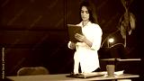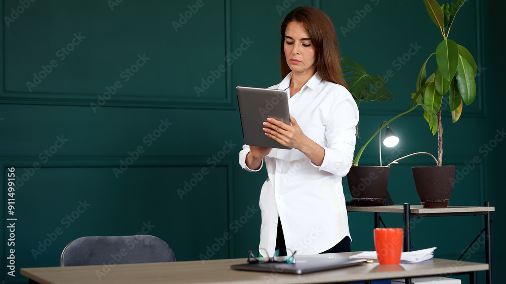 Perfect for themes of productivity, technology, and professional work environment. Focused middle-aged businesswoman working with a tablet in a modern office.