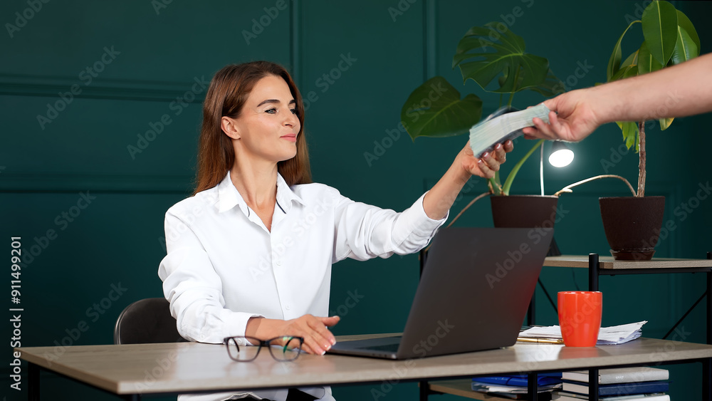 A confident and successful businesswoman celebrates a lucrative deal with a stack of money in her modern office. Perfect for themes of business success, financial achievement, and professionalism.