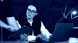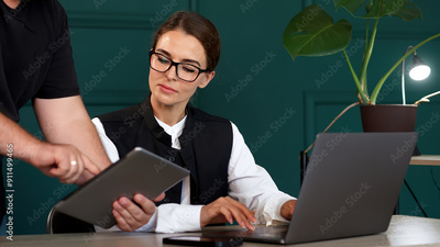 Ideal for brainstorming, teamwork, and corporate strategy topics. In a modern office, a businessman and businesswoman collaborate on a project. The man presents resources to the woman.
