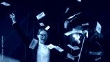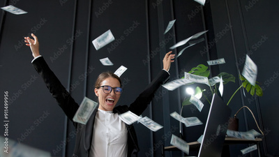 Businesswoman celebrating a money rain in her office, enjoying a bonus or successful deal. Ideal for themes of business success, financial achievement, and professional triumph.