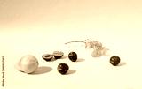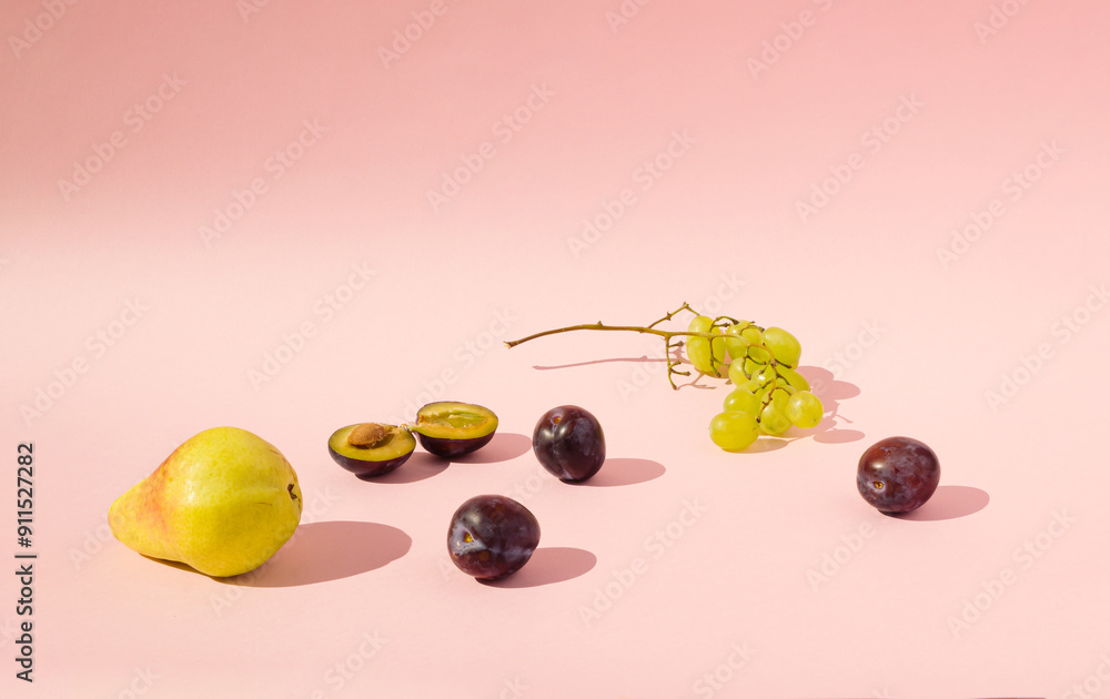 Summer layout white grapes, pear and ripe plums on the sun. Drink, fruits and shadows on pink background.