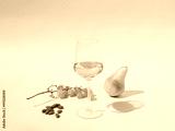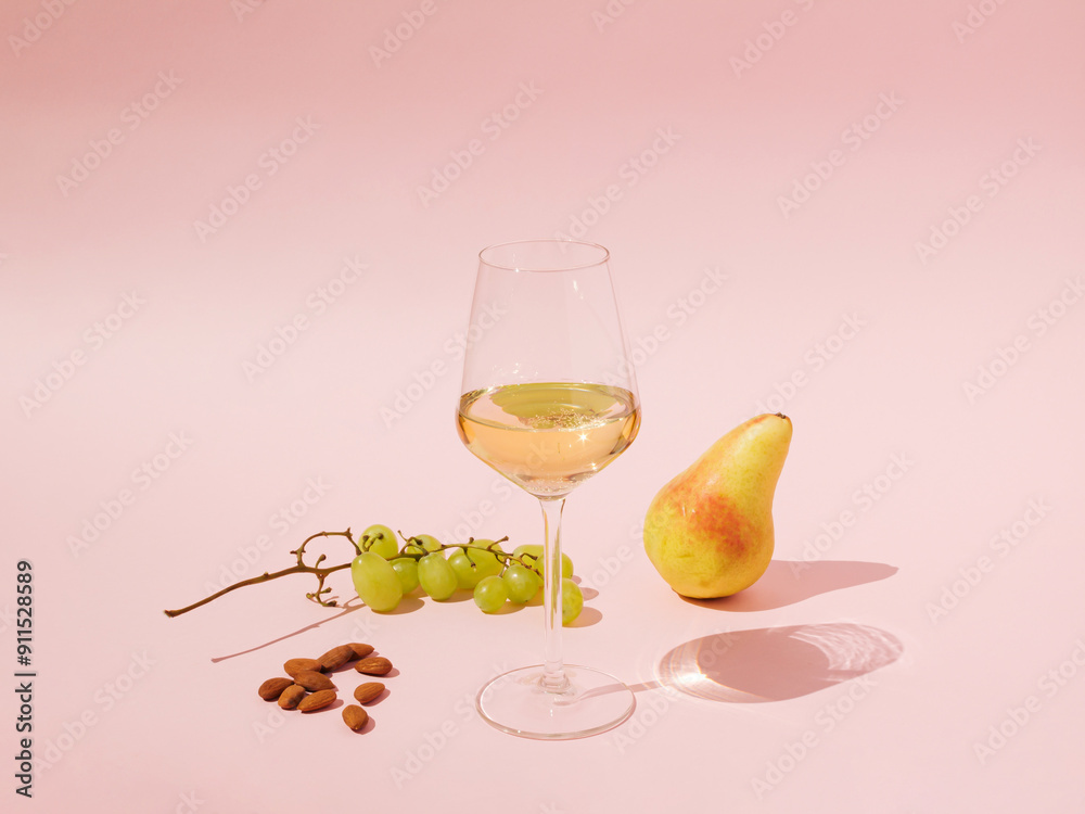 Summer layout white grapes, pear, almonds and a glass of white wine on the sun. Drink, fruits and shadows.
