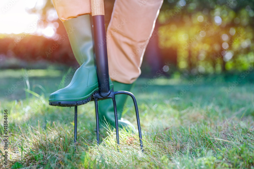 Female legs in green rubber boots and digging with a pitchfork. Autumn work and cleaning in the garden on a sunny warm autumn day.