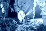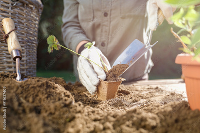 Gardening work and female hands transplanting plants. Seedlings in the garden. Autumn gardening in a warm autumn sunny day.