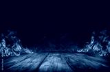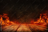 wooden table with Fire burning at the edge of the table, fire particles, sparks, and smoke in the air, with fire flames on a dark background to display products and spicy foods