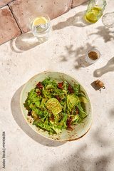 Fresh Green Salad with Avocado and Sun-Dried Tomatoes in Sunlit Aesthetic Setting