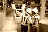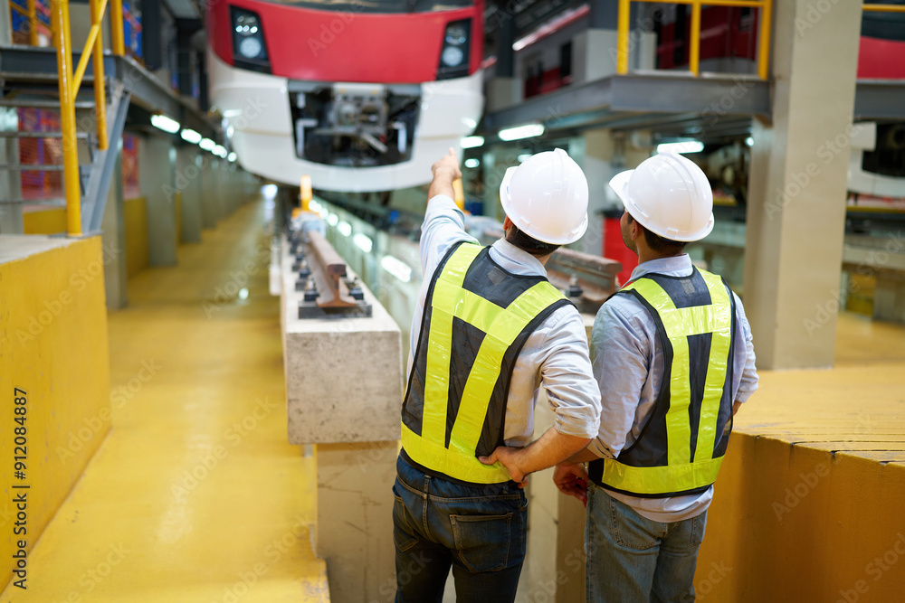 back view engineer talking and looking at high-speed rail or train at construction site