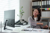 Office asian businesswoman stretching body for relaxing while working with laptop computer at her desk, office lifestyle, business situation.