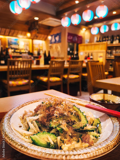 Okinawa food local dish Goya chanpuru Famous menu Stir fried bitter melon with tofu and pork serve in restaurant