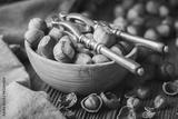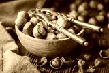 Vintage silver nutcracker on wooden plate full of open hazelnuts. Food photography