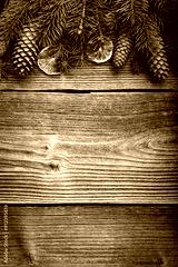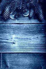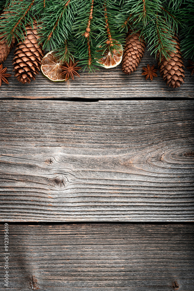 Vertical Christmas or New Year background with a border of green fir tree branches, dried lime slices and pine cones. Rustic wooden Ornament Border Background