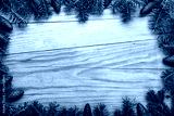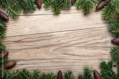 Rustic wooden background with a border of green fir branches and pine cones. Nature wooden Christmas or New Year Ornament Border Background