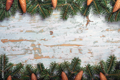 Christmas or New Year background with a wooden board, green fir branches and pine cones. Natural Ornament Border Background