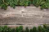 Christmas or New Year background with a border of fresh green fir tree branches on rustic wooden table