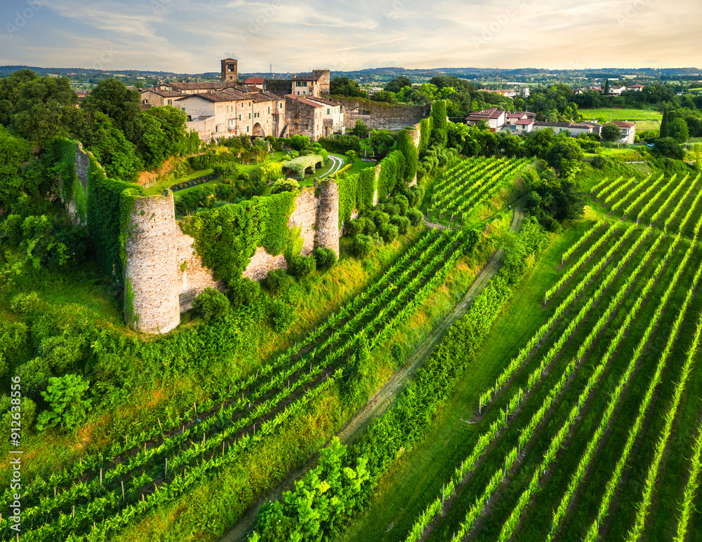 Aerial view of historic Pozzolengo Castle surrounded of vineyards, Brescia province, Lombardy, Italy.