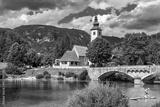 Aerial view of Bohinj lake in Julian Alps. Popular touristic destination in Slovenia. Bohinj Lake, Church of St John the Baptist. Triglav National Park, Julian Alps, Slovenia.