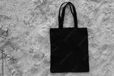 Black cotton or mesh bag on beach sand background. Zero waste, no plastic, eco friendly shopping, recycling concept. Blank mockup shopper with place for artwork or text. Flat lay, copy space