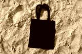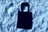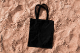 Black cotton or mesh bag on beach sand background. Zero waste, no plastic, eco friendly shopping, recycling concept. Blank mockup shopper with place for artwork or text. Flat lay, copy space